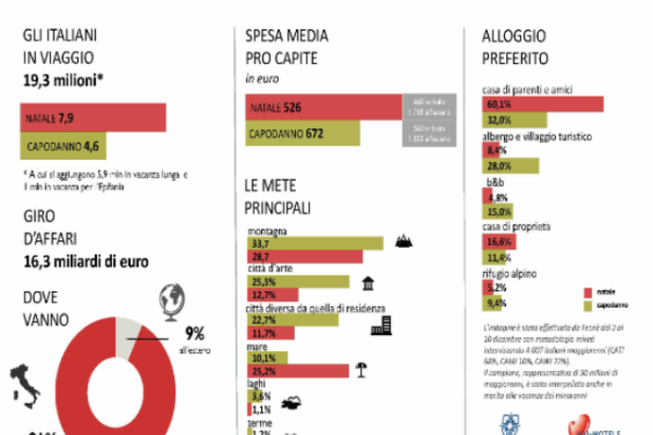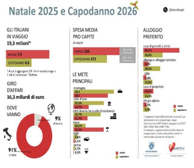 La maggioranza (91%) resterà nel Belpaese, il 9% sceglierà l’estero. Cresce la spesa complessiva delle festività 2025: giro d’affari 16,3 miliardi.