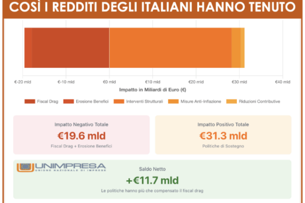 Analisi dell’associazione: tra il 2022 e il 2025 l’inflazione cumulata del 18,5% è stata assorbita grazie a un mix di politiche fiscali e dinamica del lavoro. Gli interventi del Governo sui redditi, pari a 31,2 miliardi di euro, insieme a stipendi in crescita, più occupazione e meno tasse, hanno compensato 19,6 miliardi di fiscal drag, generando un saldo positivo di 11,7 miliardi. In media, per ogni euro drenato dal fisco ne rientrano 1,6 alle famiglie. Sul piano distributivo il ceto medio tiene, le disuguaglianze si riducono e si afferma una redistribuzione di fatto, con i redditi più alti che crescono meno di quelli medi e bassi.