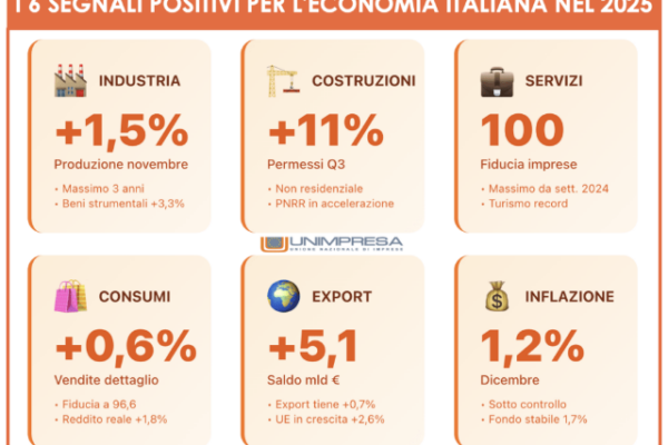 L’economia italiana chiude il 2025 con segnali complessivamente positivi e migliori delle attese, grazie a un deciso recupero dell’industria, alla tenuta dei servizi, a un export resiliente e a un’inflazione che resta su livelli contenuti. Sono sei, nel dettaglio, i fattori importanti che consentono di guardare con fiducia alla crescita economica dell’Italia. Il dato più…
