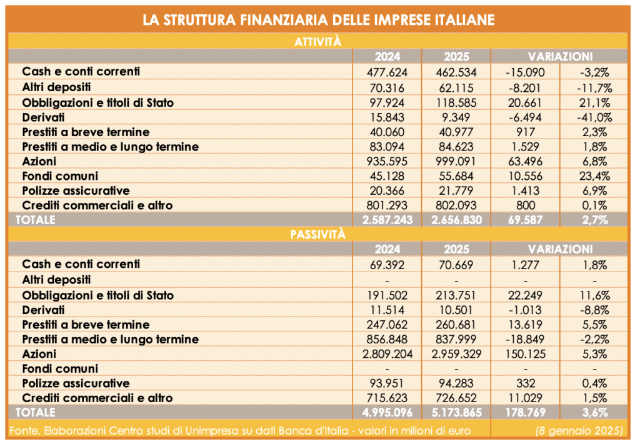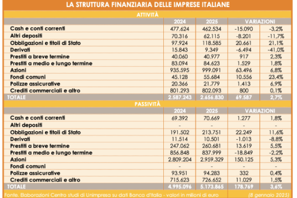 Dal 2024 al 2025 la struttura finanziaria delle imprese italiane mostra un rafforzamento complessivo, con una crescita delle attività di 69,6 miliardi di euro (+2,7%), da 2.587,2 a 2.656,8 miliardi, accompagnata da un aumento più sostenuto delle passività, pari a 178,8 miliardi (+3,6%), fino a 5.173,9 miliardi. È quanto emerge dall’analisi sulla struttura finanziaria delle imprese italiane, realizzata dal Centro…