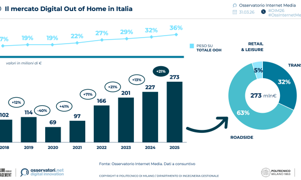 Il DOOH arriva a 273 milioni (+21%) e genera da solo l’82% della crescita del mezzo. Nel 2026 il mercato OOH è atteso a 838 milioni (+9%), spinto da Milano Cortina, innovazione tecnologica, misurazione avanzata e intelligenza artificiale.