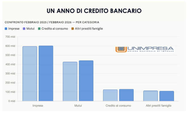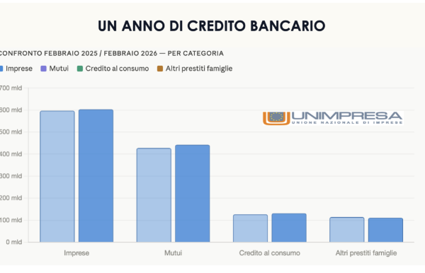 I prestiti erogati dalle banche italiane a imprese e famiglie hanno raggiunto quota 1.288 miliardi di euro a febbraio 2026, con un incremento di 23 miliardi rispetto ai 1.264 miliardi di febbraio 2025 (+1,8% su base annua). È quanto emerge da un’elaborazione del Centro studi di Unimpresa, secondo cui il risultato in crescita, ma che…
