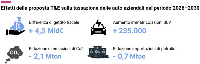 Riforma fiscale: +29% di auto elettriche, -6% import di petrolio. Secondo il modello di T&E, tra il 2026 e il 2030 questa riforma non solo genererebbe un saldo positivo di 4,3 miliardi di euro per lo Stato, riducendo le emissioni climalteranti, ma taglierebbe del 6% le importazioni di petrolio del settore trasporti e porterebbe circa 235.000 auto elettriche in più in circolazione, pari a un incremento del 29%.