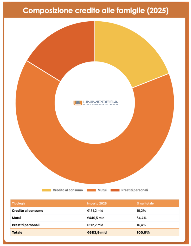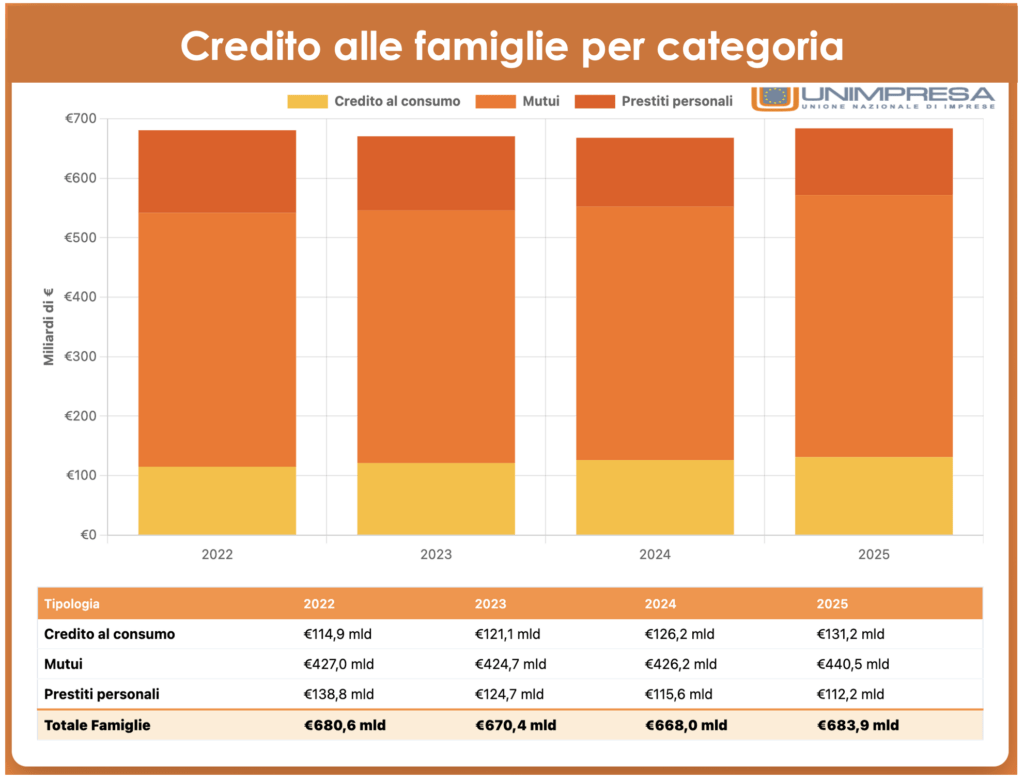 Le famiglie mostrano una dinamica più espansiva: il credito complessivo sale a 683,9 miliardi nel 2025, con un incremento di 15,9 miliardi sul 2024 (+2,4%) e di 3,3 miliardi sul 2022 (+0,5%). A trainare sono il credito al consumo, cresciuto a 131,2 miliardi (+14,2% rispetto al 2022), e i mutui per l’acquisto di abitazioni, saliti a 440,5 miliardi (+3,2% rispetto al 2022), mentre continuano a ridursi i prestiti personali, scesi a 112,2 miliardi (-19,2% rispetto al 2022): l’incremento è di 14,3 miliardi rispetto al 2024 (+3,4%).