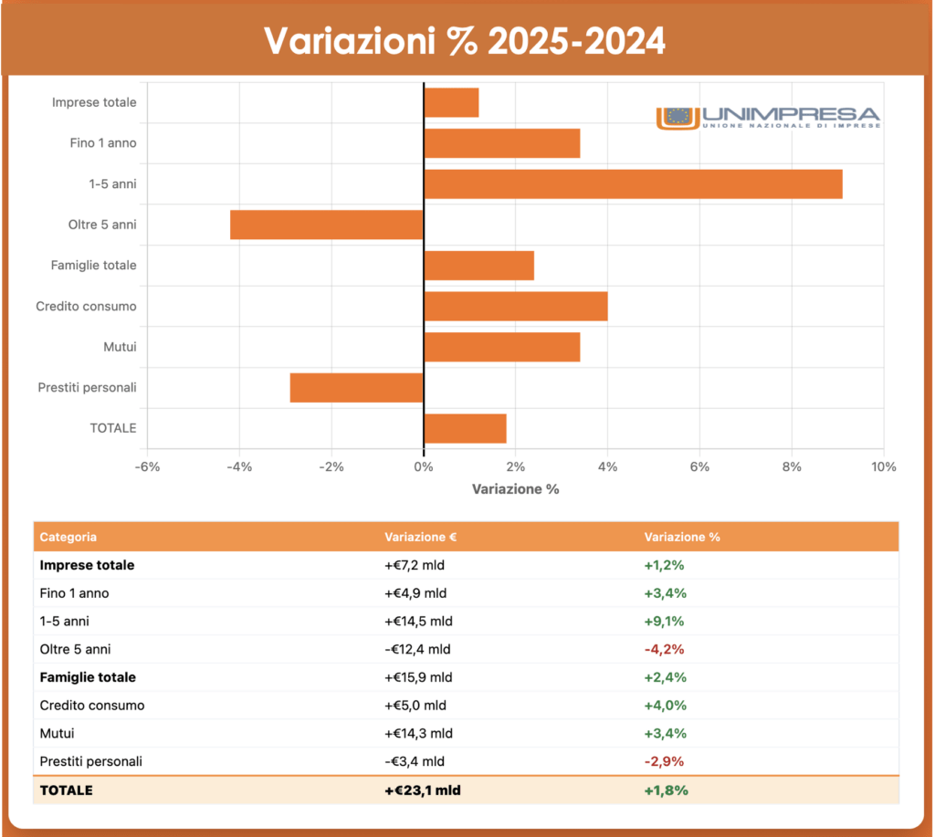 L’analisi per durata evidenzia una ricomposizione significativa: crescono i prestiti a breve termine, saliti a 150,9 miliardi nel 2025 (+4,9 miliardi sul 2024, +3,4%), e soprattutto quelli di medio periodo, tra uno e cinque anni, arrivati a 174 miliardi (+14,5 miliardi, +9,1%).