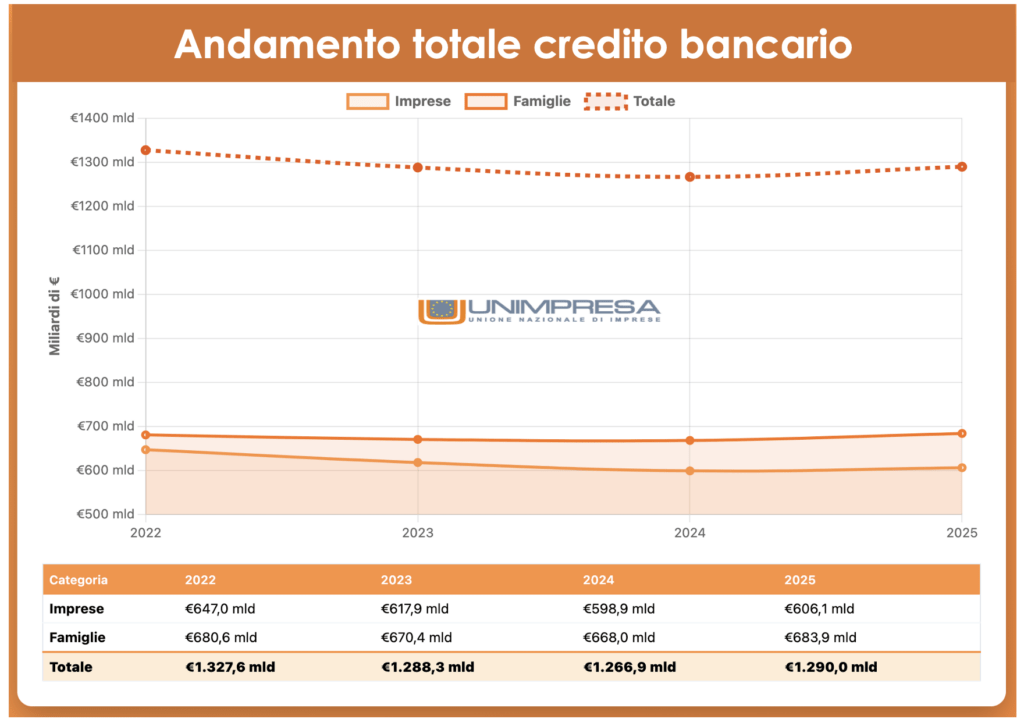 È quanto emerge dal rapporto sul credito nel 2025 realizzato dal Centro studi di Unimpresa, secondo il quale, nel complesso, il totale dei prestiti bancari al settore privato – imprese e famiglie – si è attestato a 1.290 miliardi di euro lo scorso anno, in crescita di 23,1 miliardi rispetto al 2024 (+1,8%), ma ancora inferiore di 37,6 miliardi rispetto al 2022 (-2,8%).