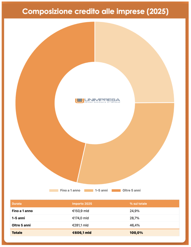 Prosegue invece la contrazione del credito oltre i cinque anni, sceso a 281,1 miliardi, in calo di 12,4 miliardi rispetto al 2024 (-4,2%) e di 65,9 miliardi rispetto al 2022 (-19%).