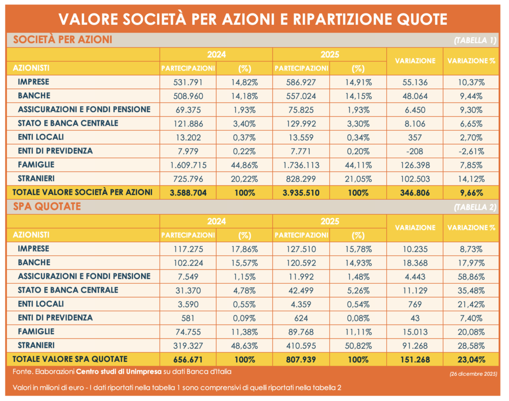 È quanto emerge da una analisi del Centro studi di Unimpresa, che prende in considerazione il valore delle azioni detenute dalle varie categorie di soci e azionisti, da giugno 2024 a giugno 2025.