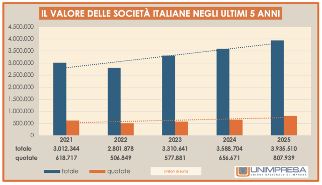 L’accelerazione più intensa si registra nel 2025, quando il valore totale delle società per azioni arriva a 3.936 miliardi di euro, crescendo di 347 miliardi (+9,7%), mentre il valore delle società quotate supera gli 808 miliardi, con un incremento di 151 miliardi (+23,0%).