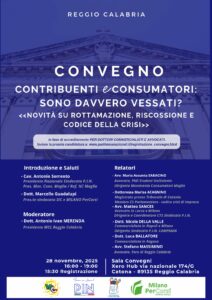 Fanno sapere gli organizzatori: “Siamo lieti di ospitare a Reggio Calabria il convegno dal titolo Contribuenti e consumatori: sono davvero vessati? Novità su rottamazione, riscossione e codice della crisi. L’evento è in fase di accreditamento per i commercialisti e anche presso l’Ordine degli avvocati di Reggio Calabria. La finalità è quella di fare il punto sulle novità che interessano maggiormente cittadini e imprese in questo periodo e dunque anche la sentenza di Lecce sarà oggetto di attenzione insieme ad altre novità in materia di codice della crisi”.