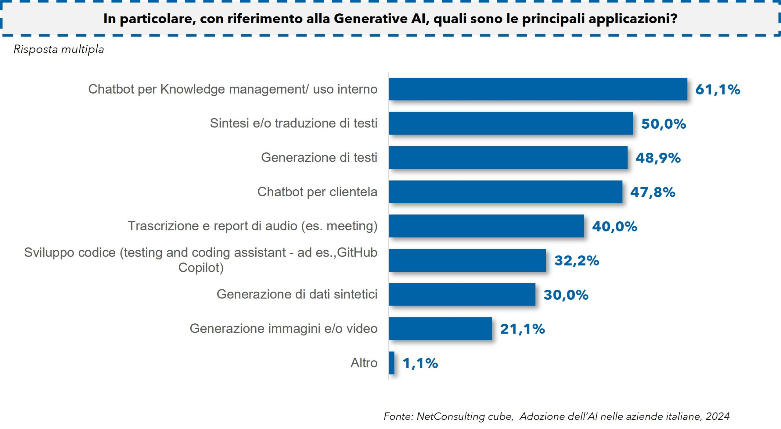 “Questa survey delinea trend e ambiti di adozione dell’AI nel mondo d’impresa e una mappa dei principali casi d’uso, valutando anche il livello di maturità delle aziende nel percorso di adozione dell’intelligenza artificiale e nella sua effettiva integrazione nei processi. Il nostro Maturity Model si pone l’obiettivo di offrire alle aziende un benchmark di riferimento per poter comprendere come sfruttare al meglio l’Intelligenza artificiale”, prosegue Rossella Macinante (BU Leader di NetConsulting cube).