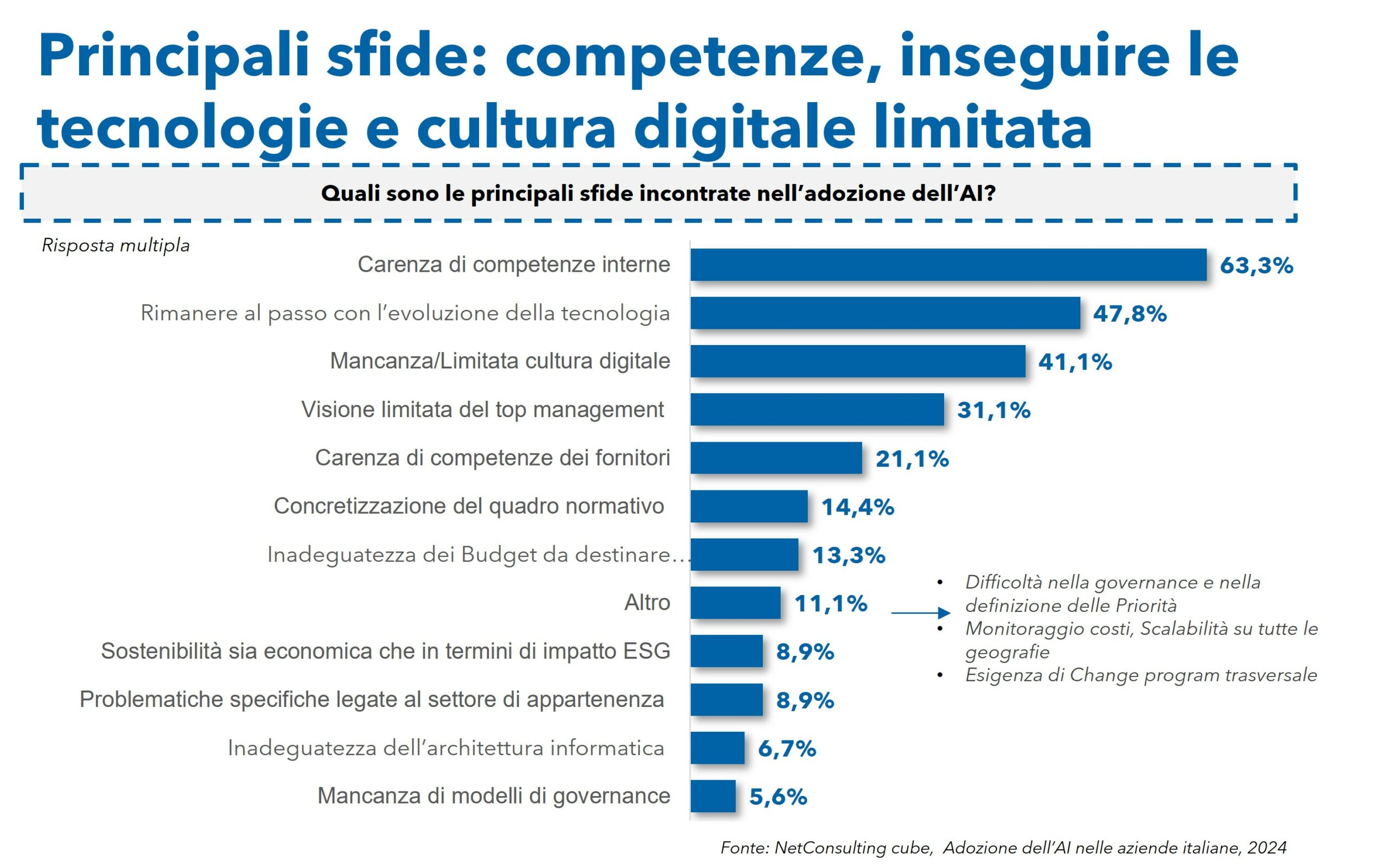 Degna di nota, infine, l’assenza nel Panel dei Business AI Driven: aziende che hanno adottato una strategia nella quale l’AI è parte del modello di business e dello sviluppo dei prodotti e servizi, con un livello di maturità molto elevato e tutte le Business Units orientate a sfruttare l’AI come leva competitiva e integrata nei processi chiave dell’azienda.