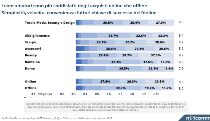 “I consumatori italiani hanno affinato le loro aspettative verso gli acquisti di moda e lifestyle. In ogni canale e in ogni momento del loro percorso di shopping ricercano la qualità del servizio e ad oggi i dati di soddisfazione mostrano come l’online si contraddistingua per semplicità, velocità e appagamento complessivo. La rilevanza dei punti di contatto fisici rimane tuttavia fondamentale e le aziende più attente stanno proprio lavorando su questo aspetto per integrare elementi di fisicità all’interno dell’esperienza virtuale di acquisto, ad esempio tramite il livestreaming commerce che è in Asia un fenomeno importante e del quale sentiremo presto parlare anche in Italia” ha commentato Roberto Liscia, Presidente di Netcomm.