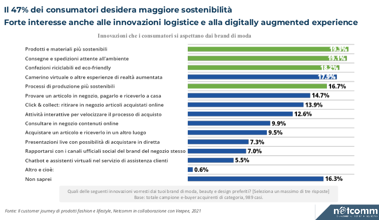 È quanto emerso dalla ricerca “Il Customer Journey di prodotti Fashion e Lifestyle” pubblicata da Netcomm, in collaborazione con Veepee, presentata durante questa prima giornata di Netcomm Forum Industries e dedicata alle abitudini e alle tendenze dei consumatori nel settore Fashion&Lifestyle. La sostenibilità è certamente l’ambito di innovazione su cui i consumatori si aspettano di più dai brand: il 47% del campione considerato dalla ricerca si aspetta che i brand si impegnino a innovare e implementare in ottica di sostenibilità tutti gli aspetti relativi al processo di produzione e di acquisto online di un prodotto. Gli e-shopper si aspettano soluzioni sostenibili non solo nella scelta dei materiali e nella produzione, ma anche delle modalità di consegna e spedizione, che devono essere sempre più attente all’ambiente circostante, e delle confezioni, le quali devono essere riciclabili ed eco-friendly.