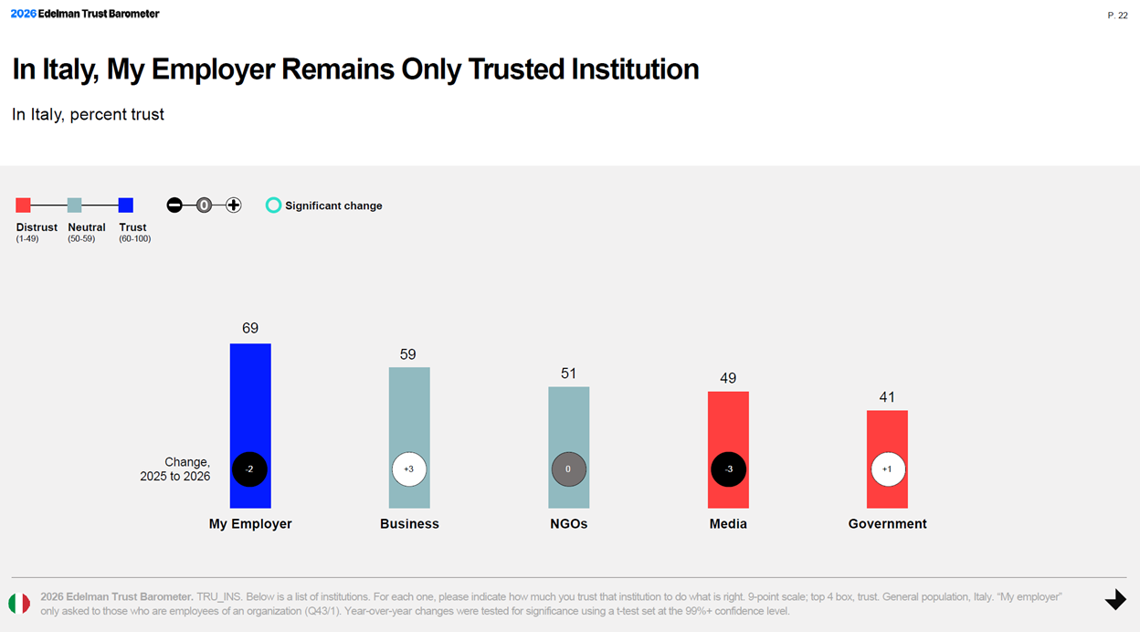 “L’edizione 2026 dell’Edelman Trust Barometer – commenta Fiorella Passoni, CEO di Edelman Italia – descrive un contesto globale segnato da una crescente chiusura, in cui le preoccupazioni per l’economia, le rivoluzioni nel settore delle tecnologie e le altalenanti tensioni geopolitiche spingono gli individui a restringere il proprio orizzonte verso gruppi sempre più ristretti, più allineati alle proprie convinzioni. E questo ha un impatto diretto sui livelli di fiducia nei confronti di tutte le istituzioni. La polarizzazione che nel 2025 si è trasformata in malcontento – ‘grievance’ – oggi ha lasciato il posto all’‘insularity’: una sorta di diffidenza, dimostrata dal 79% degli intervistati, verso chi è percepito come diverso; chi, cioè non condivide gli stessi valori, le stesse fonti di informazione, la stessa visione del mondo. I dati italiani – conclude Passoni – mostrano però una popolazione consapevole delle sfide ma desiderosa di soluzioni concrete e la fiducia nel datore di lavoro e l’apertura verso modelli di mediazione posizionano il nostro Paese come un potenziale laboratorio per pratiche innovative nella costruzione della fiducia”.