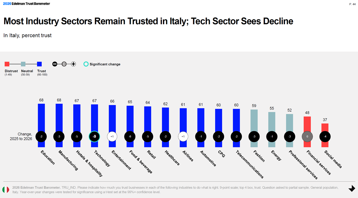 L’edizione 2026 segna un cambiamento “epocale”. Dopo aver fatto registrare per anni i livelli più alti di fiducia, il settore della tecnologia fa registrare un calo drastico di 9 punti toccando quota 67. Una discesa che fa salire in prima posizione tra i settori in cui gli italiani ripongono maggiore fiducia la manifattura e l’educazione appaiati in testa a 68 punti.