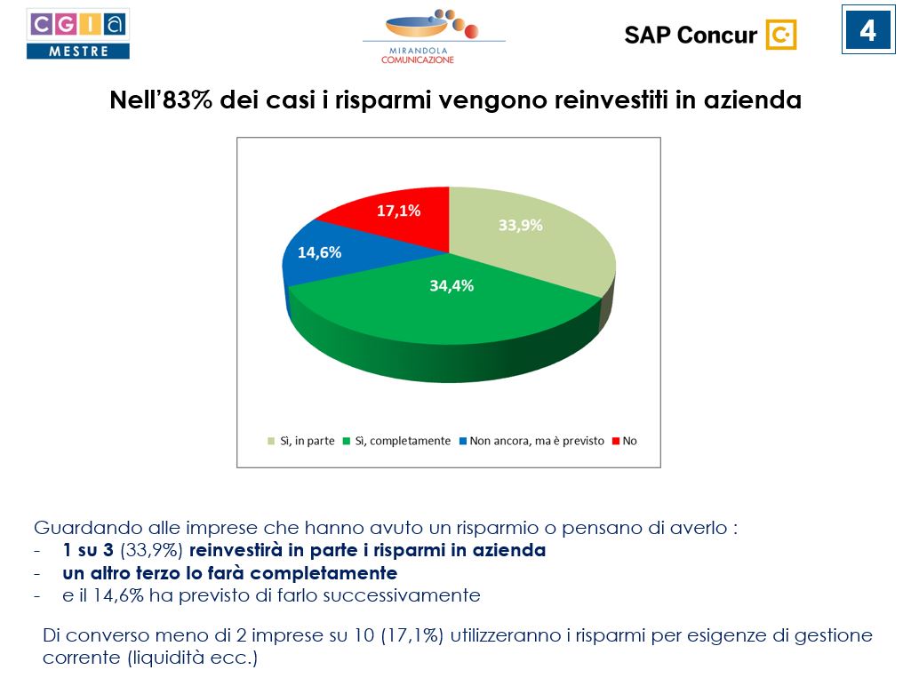 Nell’83% dei casi i risparmi vengono reinvestiti in azienda, in particolare: 1 su 3 (33,9%) reinvestirà in parte i risparmi in azienda, un altro terzo (34,4%) lo farà completamente e il 14,6% ha previsto di farlo successivamente. Al contrario, meno di 2 imprese su 10 (17,1%) utilizzeranno i risparmi per esigenze di gestione corrente, come liquidità.
