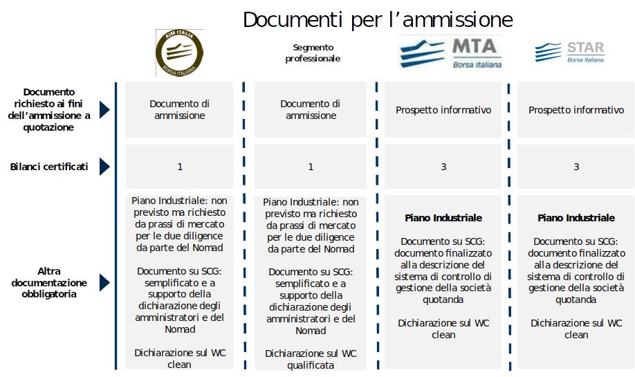 A livello di documentazione, deve essere presentato un Documento di Ammissione contenente le informazioni relative all’attività della società, al management, agli azionisti e ai dati economico-finanziari. La struttura del documento segue il modello previsto per il prospetto informativo previsto dal Regolamento 809/2004/CE di attuazione della normativa prospetto, pur contenendo un minor numero di informazioni e non tutti i capitoli previsti per un prospetto ordinario. Insieme al Documento di Ammissione deve essere presentato almeno un bilancio d’esercizio (consolidato se il perimetro di riferimento è relativo ad un gruppo), certificato da un revisore legale e redatto secondo i principi nazionali o IAS/IFRS. Non è, invece, richiesta la presenza di un numero minimo di bilanci chiusi.