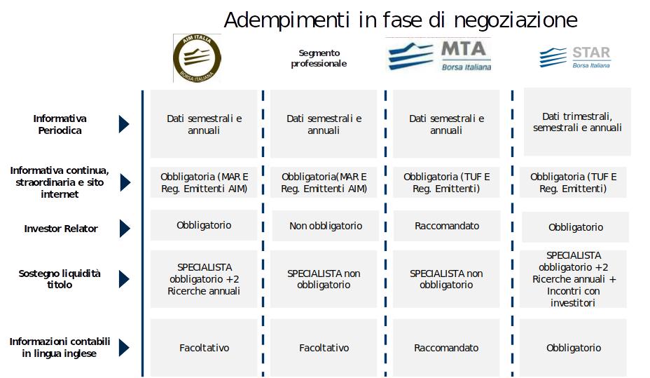 La maggiore flessibilità regolamentare che caratterizza l’AIM Italia rispetto al mercato regolamentato in Italia è testimoniata, come appena descritto, dai requisiti meno stringenti previsti sia in fase di ammissione che in fase di negoziazione rispetto al mercato regolamentato MTA ed al Segmento STAR, qui di seguito riassunti in uno quadro sinottico per una più diretta e facile lettura.