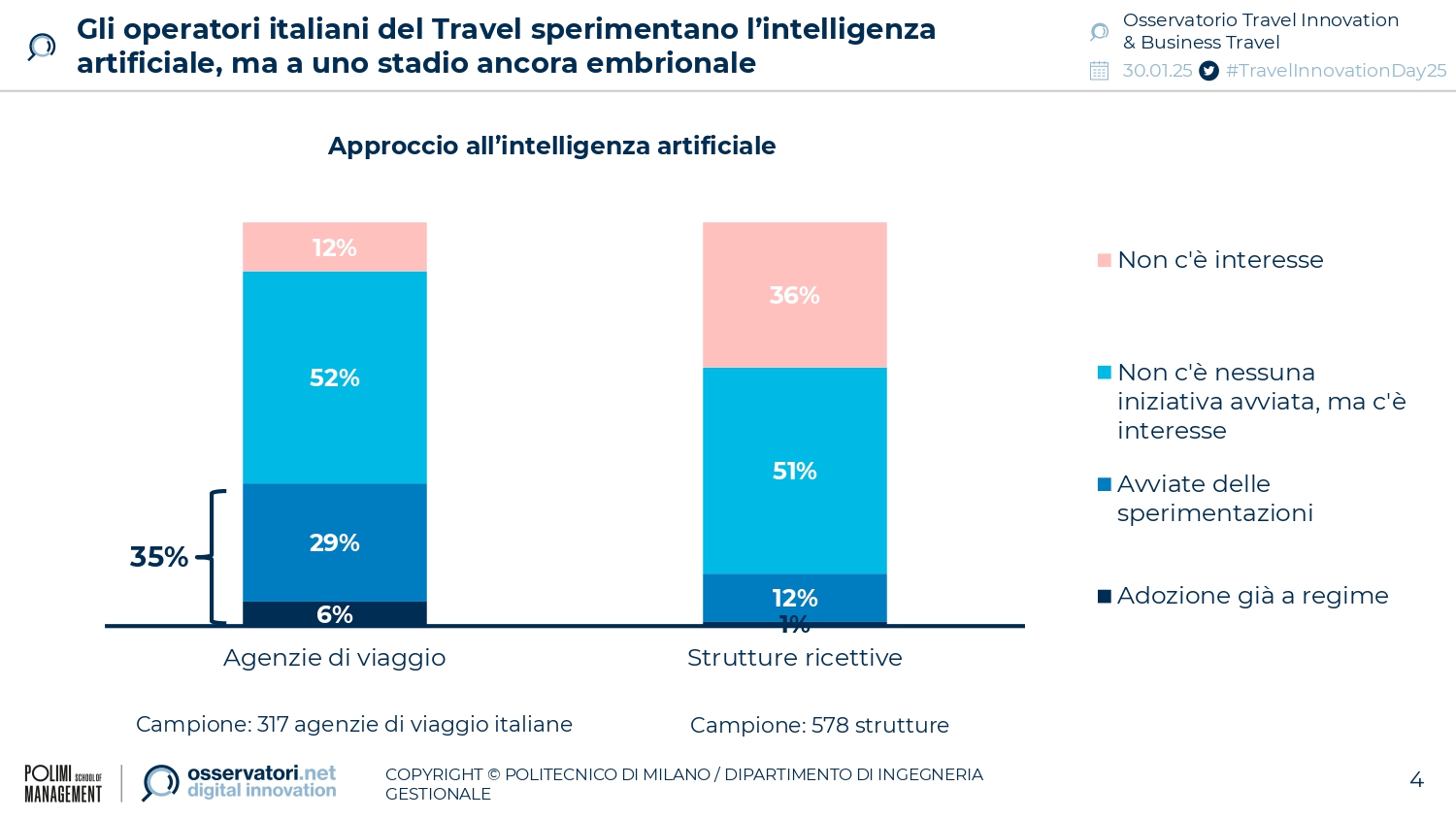 Gli operatori italiani del Travel stanno iniziando a sperimentare l’intelligenza artificiale. Le agenzie di viaggio adottano l’intelligenza artificiale in misura maggiore rispetto al settore dell’Ospitalità: solo l’1% delle strutture ricettive sfrutta l’AI in modo completo, mentre il 12% ha avviato sperimentazioni, contro il 6% e il 29% delle agenzie di viaggio.