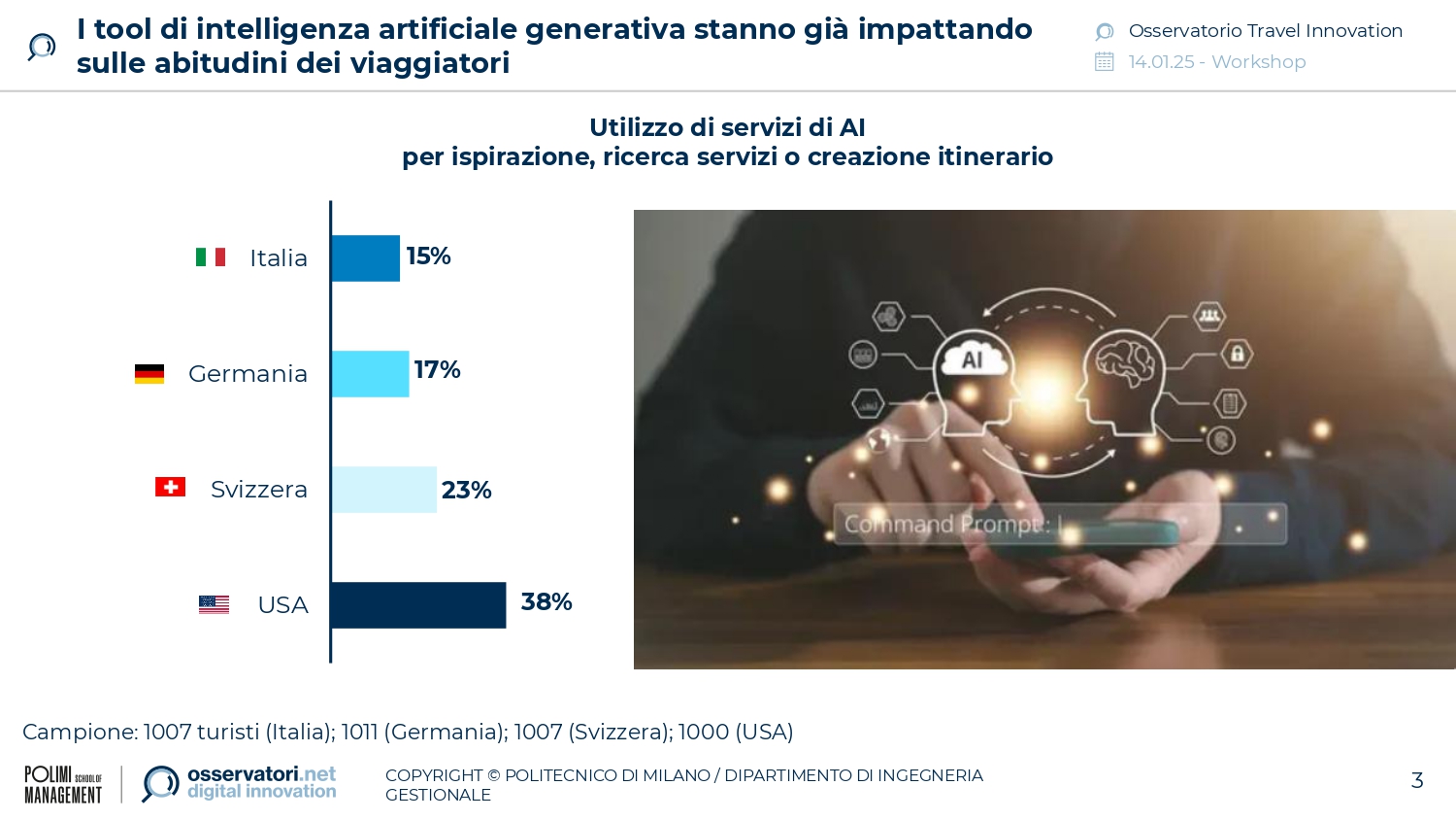 Gli strumenti di intelligenza artificiale generativa stanno già influenzando in modo significativo le abitudini dei viaggiatori, che li utilizzano principalmente nelle fasi di ispirazione e ricerca. In Italia l’adozione di questa innovazione sta avvenendo in modo graduale, con un tasso di utilizzo del 15%.