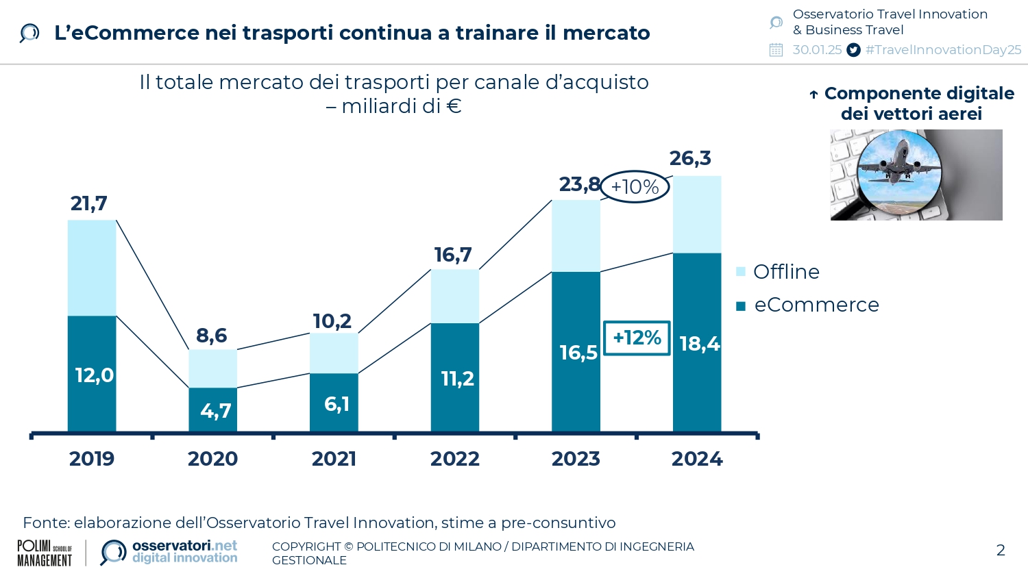 Il mercato dei trasporti ha invece registrato un +10%, principalmente dovuto all’aumento del volume di passeggeri, in particolare nel segmento aereo, per un totale di 26,3 miliardi di euro, di cui 18,4 miliardi provenienti dalla componente eCommerce (+12%).