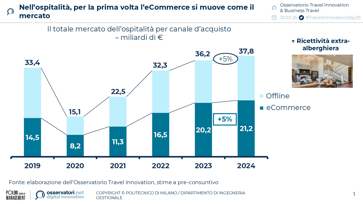In Italia nel 2024 il comparto dell’Ospitalità ha raggiunto i 37,8 miliardi di euro, con un incremento del +5% rispetto all’anno precedente. Per la prima volta in dieci anni anche la componente eCommerce ha fatto segnare lo stesso tasso di crescita dell’intero settore, raggiungendo i 21,2 miliardi di euro.