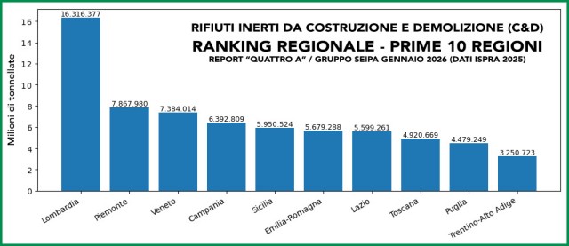 Dal punto di vista territoriale, il Nord mantiene il primato in termini di volumi assoluti: la Lombardia guida la classifica con 16,3 milioni di tonnellate, seguita da Piemonte (7,9 milioni) e Veneto (7,4 milioni). Completano la top five Campania (6,4 milioni) e Sicilia (6 milioni).