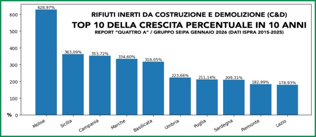 In 10 anni la produzione di rifiuti inerti da costruzione e demolizione (C&D) in Italia è cresciuta del 65,35%, passando da 49,2 milioni di tonnellate a 81,4 milioni. È quanto emerge dall’analisi 2026 di Quattro A, società del Gruppo Seipa, basata sui dati del Rapporto rifiuti speciali dell’Ispra.