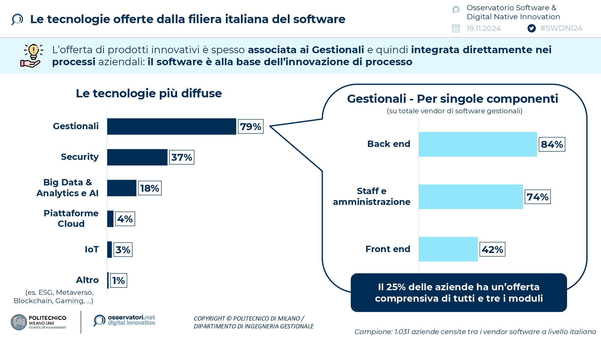 Per comprenderne il potenziale, la ricerca ha approfondito l’offerta presente a livello nazionale attraverso un censimento di 1.884 PMI e grandi imprese operanti nel campo del software, coprendo il 59% del fatturato complessivamente generato, di cui 1.031 produttori di soluzioni proprietarie. Tra i prodotti più diffusi tra i vendor italiani, emergono i Gestionali (offerti dal 79% delle aziende censite), seguiti dai software di Cybersecurity (37%) e di Analytics & AI (18%).