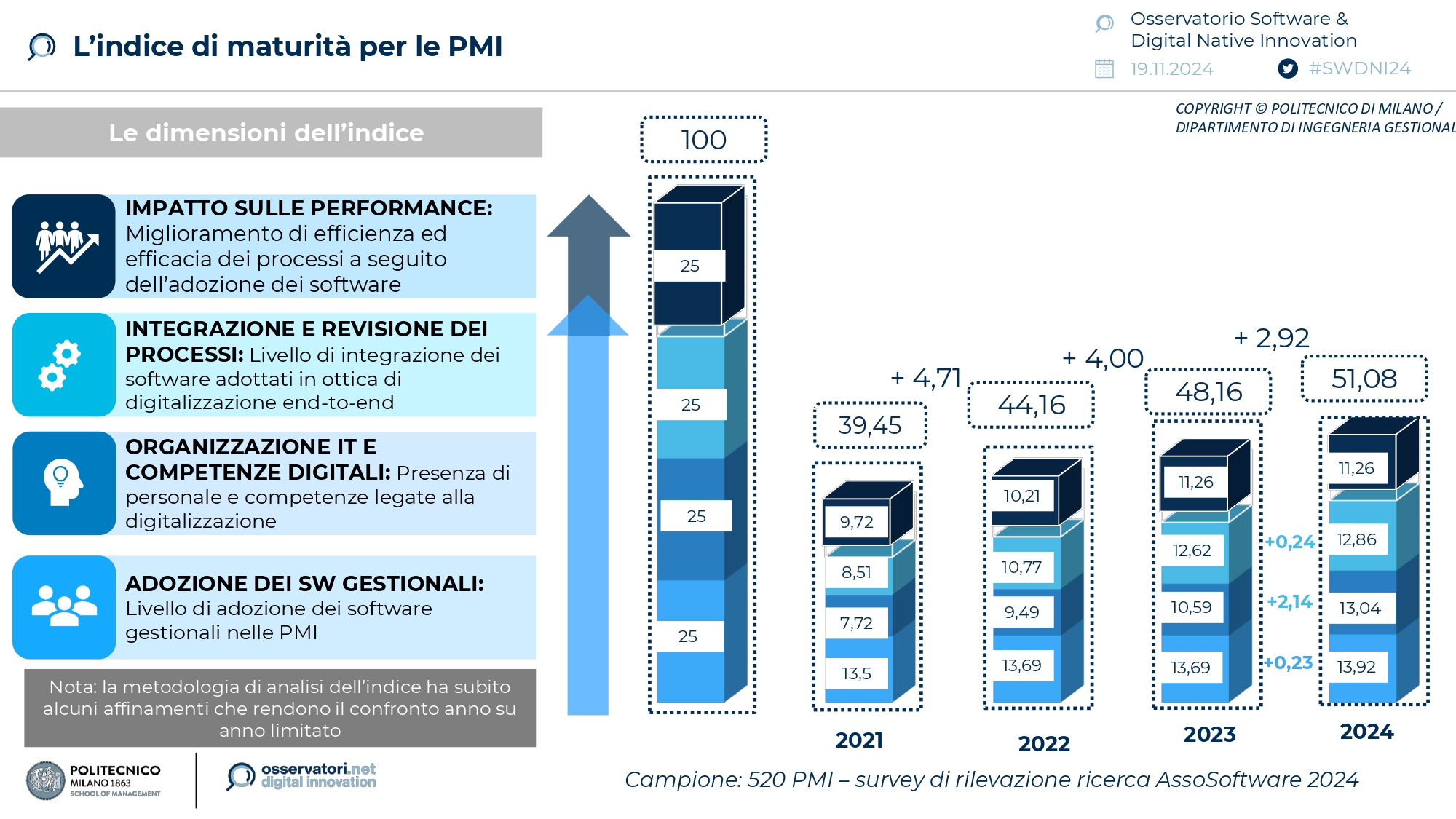 software Gestionali sono i più diffusi all’interno dell’offerta italiana di applicativi e rispondono a un tessuto di clientela prevalentemente caratterizzato da PMI del territorio. L’Osservatorio monitora l’impatto di queste soluzioni sulla digitalizzazione delle PMI attraverso un indice dedicato, che con un punteggio da 0 a 100 ne determina la maturità di utilizzo secondo quattro dimensioni: adozione dei software, presenza di personale e competenze dedicate, livello di integrazione e impatto sulle performance.