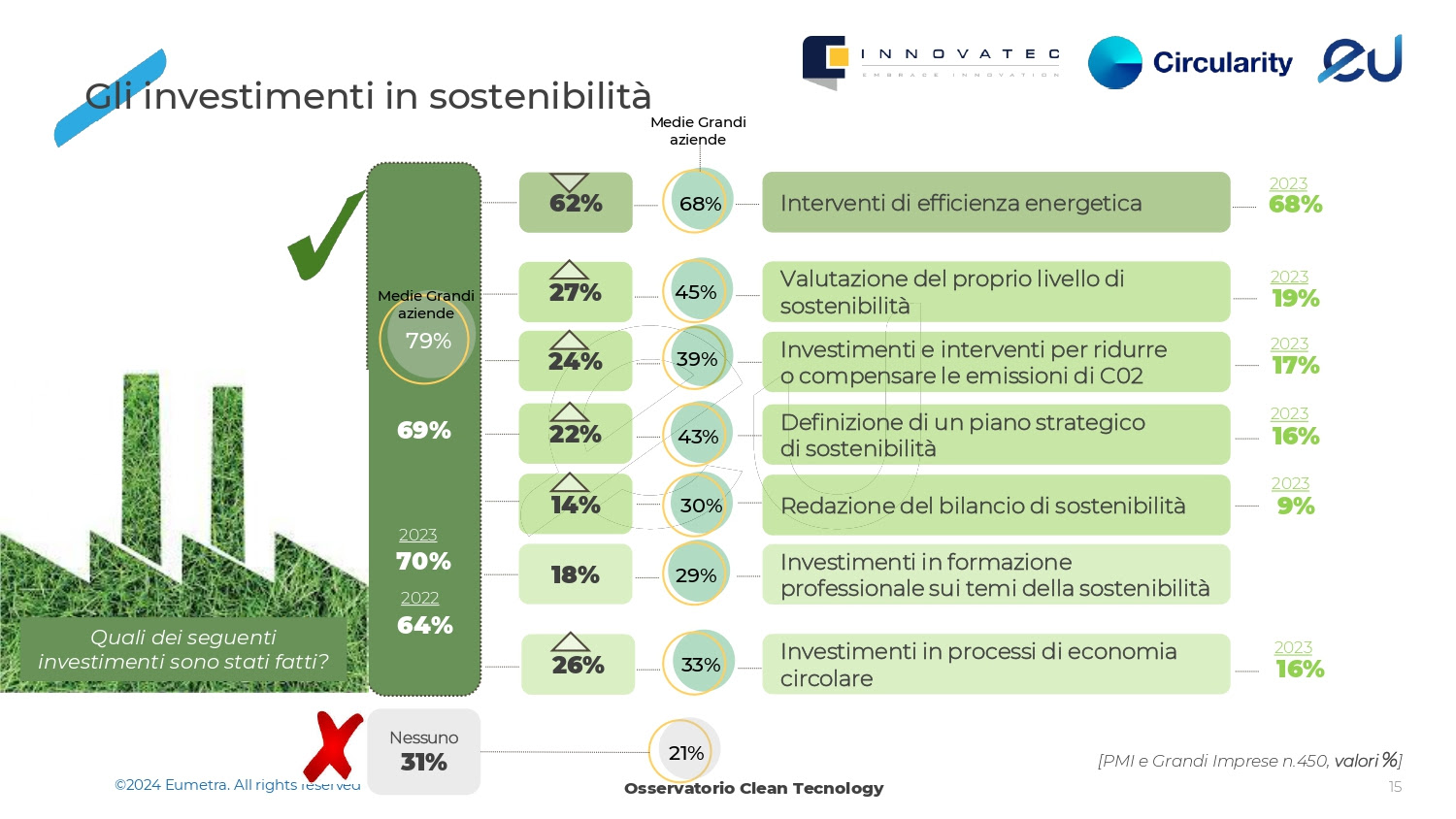 - il 69% delle aziende italiane ha effettuato investimenti in sostenibilità