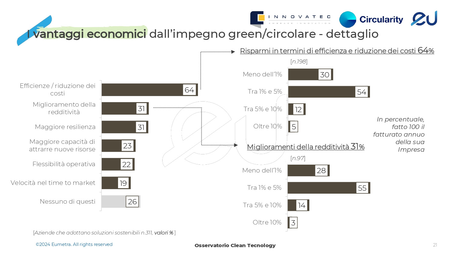 - il 73% delle imprese ritiene che gli investimenti in sostenibilità energetica e ambientale possano generare un vantaggio economico e un’impresa su due lo ha già realizzato, principalmente in termini di maggiore efficienza e miglioramento della redditività