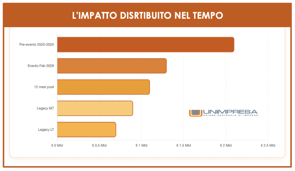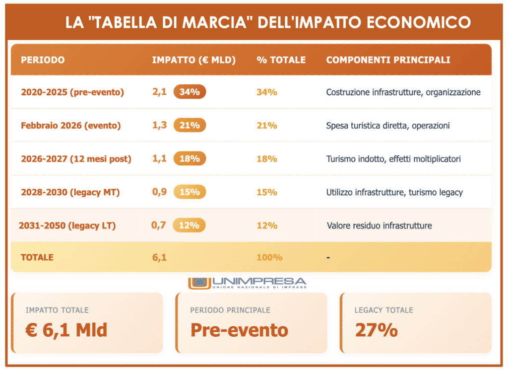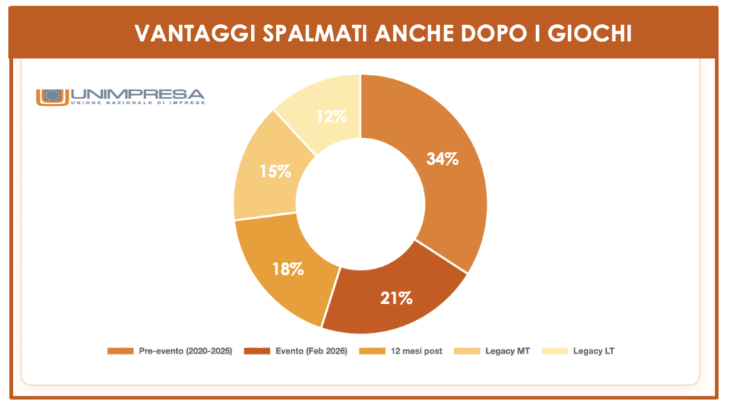 Il solo mese di febbraio 2026, durante lo svolgimento dei Giochi, genera 1,3 miliardi, ovvero il 21% dell’impatto complessivo, grazie alla spesa turistica diretta e alla piena operatività dell’evento.