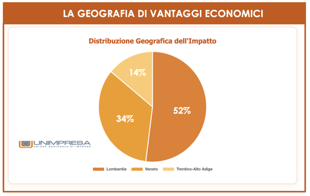Dal punto di vista macroeconomico, l’impatto di 6,1 miliardi equivale a circa 0,12-0,15 punti percentuali di PIL nazionale, distribuiti su più anni. A livello territoriale, l’impatto risulta più concentrato. La Lombardia assorbe circa il 52%del valore complessivo, pari a 3,2 miliardi, il Veneto il 34% con 2,1 miliardi, mentre il Trentino-Alto Adige intercetta il restante 14%, pari a 800 milioni. Rapportato al PIL regionale, l’impatto equivale a circa 0,7% per la Lombardia, 1,2%per il Veneto e 1,6% per il Trentino-Alto Adige, evidenziando un effetto particolarmente significativo per le economie di dimensione più contenuta.
