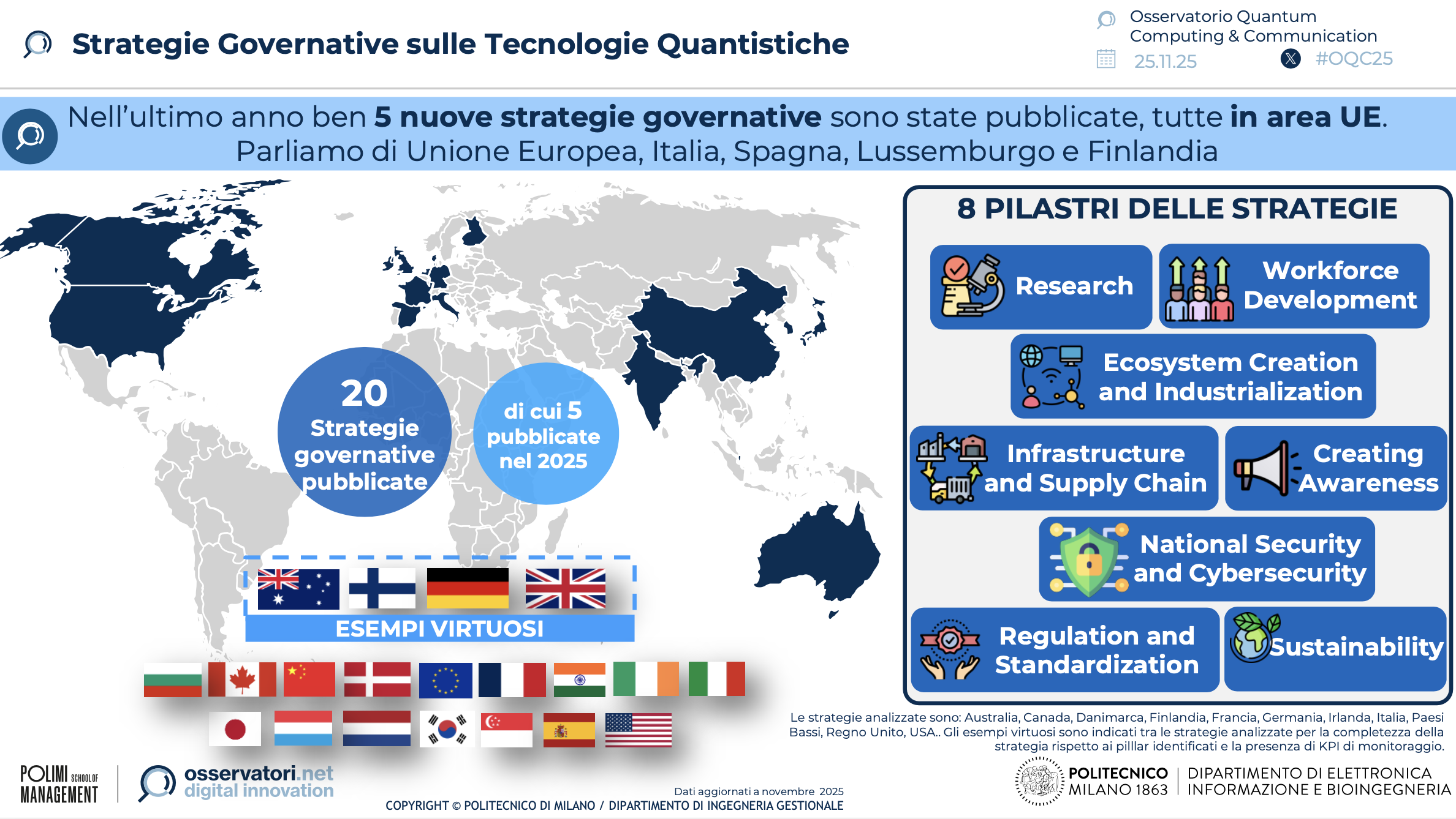 Nel 2025 è stata varata la strategia quantistica europea, segnando il passaggio da una visione frammentata a una più unitaria, con l’obiettivo di portare l’Europa alla leadership globale entro il 2030. È atteso a breve il Quantum Act.