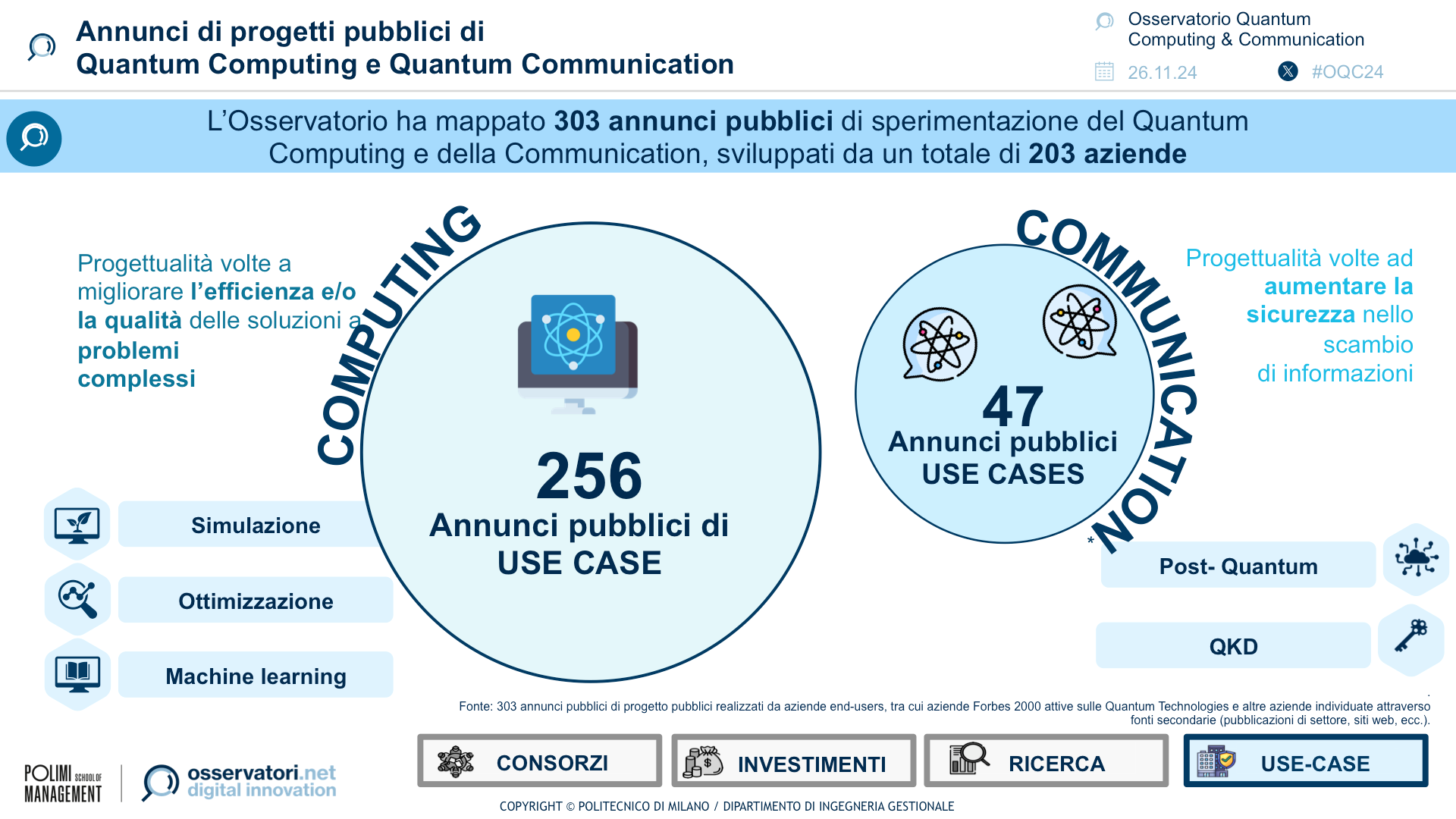“Nel 2024, il panorama del Quantum Computing si è configurato come un autentico territorio di frontiera, dove convergono ricerca accademica, investimenti industriali e strategie geopolitiche. È stato un anno cruciale per la tecnologia italiana, con risultati significativi come il primo computer quantistico criogenico costruito in Italia, sviluppato dall’Università Federico II di Napoli, che ha raggiunto la capacità di 24 qubit, la prima piattaforma fotonica italiana, realizzata da un team di centri di ricerca coordinato dall’Università La Sapienza di Roma e l’innovativa piattaforma di simulazione sviluppata dall’Università di Padova in collaborazione con il CINECA.” afferma Paolo Cremonesi, Responsabile Scientifico dell’Osservatorio Quantum Computing & Communication e docente del Dipartimento di Elettronica, Informazione e Bioingegneria del Politecnico di Milano “I laboratori d’eccellenza italiani stanno favorendo la nascita di iniziative imprenditoriali interessanti, seppur con numeri e investimenti ancora molto minori rispetto ad altri Stati Europei. Nonostante ciò, alcune startup italiane promettenti offrono prodotti di Quantum Key Distribution già integrati in reti quantistiche permanenti, come quella inaugurata a Napoli a inizio anno, e utilizzati nelle sperimentazioni del G7. Inoltre, ben due startup italiane sono rientrate nel programma di accelerazione della NATO.”