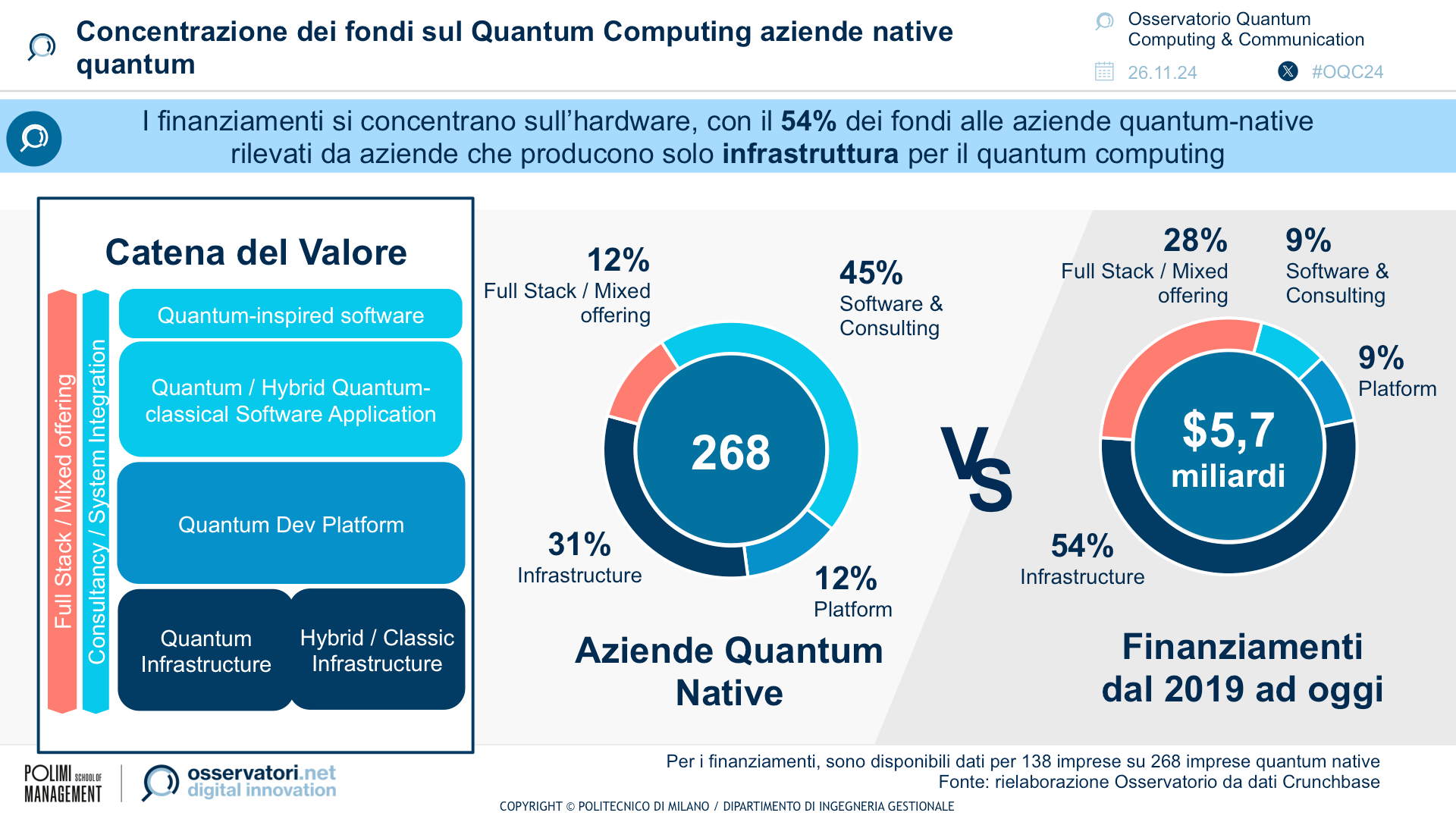 La filiera tecnologica di Quantum Computing e Communication nel mondo è emergente, ma in crescita: l’Osservatorio ha identificato 458 attori attivi lungo l’intero strato tecnologico, che va dall’hardware e dalle sue componenti abilitanti, agli ambienti middleware, fino al software. Di questi attori, il 78% rappresenta imprese “quantum-native”, ovvero nate con un modello di business incentrato su questo ambito.
