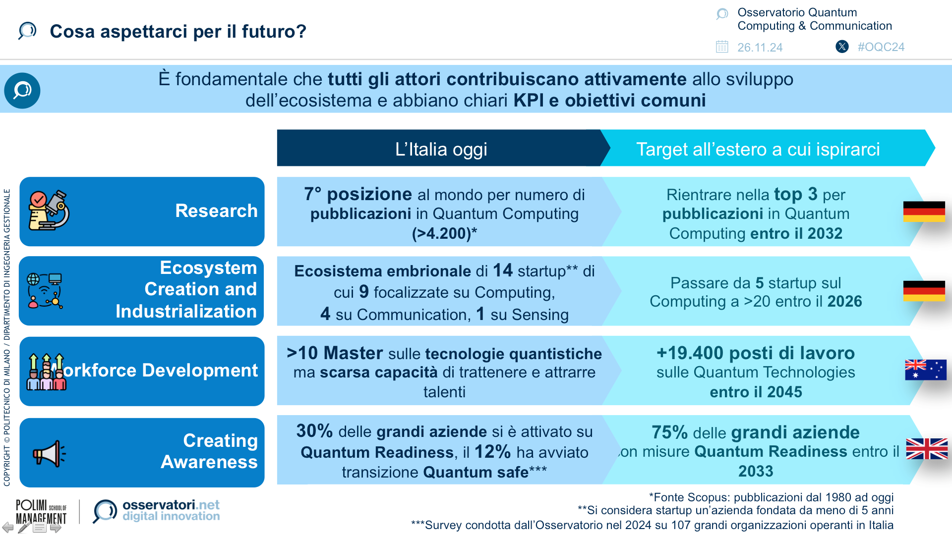“Nel corso degli ultimi due anni, i fondi del PNRR hanno svolto un ruolo fondamentale per la creazione di un ecosistema italiano sulle tecnologie quantistiche, promuovendo la sinergia tra università e imprese. Tuttavia, per accrescere questo ecosistema e renderlo competitivo, è necessario partire da questo primo pilota per costruire una strategia nazionale che dia continuità ai fondi e fornisca obiettivi coordinati, in sinergia con quelli Europei” conclude Marina Natalucci, Direttore dell’Osservatorio Quantum Computing & Communication “Nelle istituzioni italiane ed europee si sta diffondendo una sempre maggiore consapevolezza sul ruolo critico di questo settore per la competitività futura dell’Europa in campo tecnologico. Per accompagnare questo comparto emergente dalla fase di ricerca e sviluppo attuale a quella industriale del futuro, è importante investire oggi creando una rete pubblico-privata coesa che lavori in modo coordinato a livello europeo e che si relazioni in modo strategico con gli ecosistemi esteri per accelerare l’innovazione.”