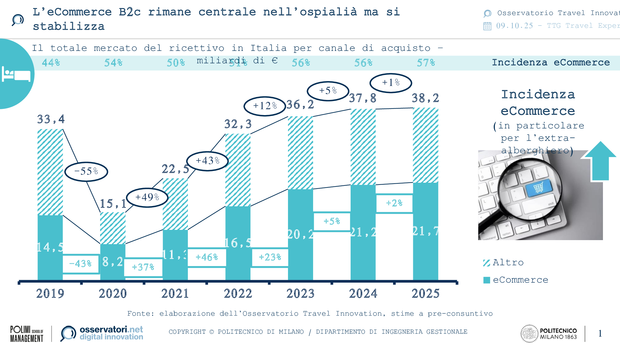 “Quest’anno non è tanto l’online a trainare il ricettivo, – commenta Filippo Renga, Direttore dell’Osservatorio Travel Innovation del Politecnico di Milano – quanto piuttosto l’aumento dei prezzi, che ha sostenuto la crescita del settore pur in presenza di una domanda in lieve contrazione. L’eCommerce resta comunque centrale, con un’incidenza ormai strutturale sul mercato, ma la sua crescita si è allineata a quella complessiva, segnalando che siamo entrati in una fase di maturità: non più boom, bensì consolidamento dei modelli digitali e maggiore attenzione all’equilibrio tra canali online e offline.”