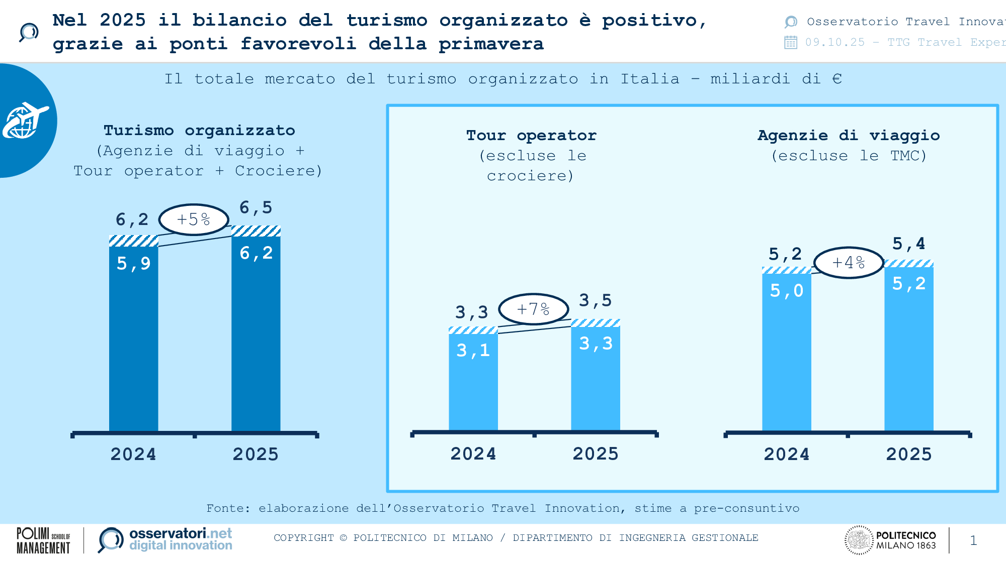 Il turismo organizzato prosegue la crescita a tassi superiori al ricettivo, grazie in particolare alla componente outgoing e a una primavera ricca di ponti. Il comparto, che include le componenti agenzie, tour operator e crociere, si assesta tra i 6,2 e i 6,5 miliardi di euro (+5% sul 2024). La crescita è guidata in particolare dai tour operator (+7%), mentre le agenzie di viaggio registrano un +4%.