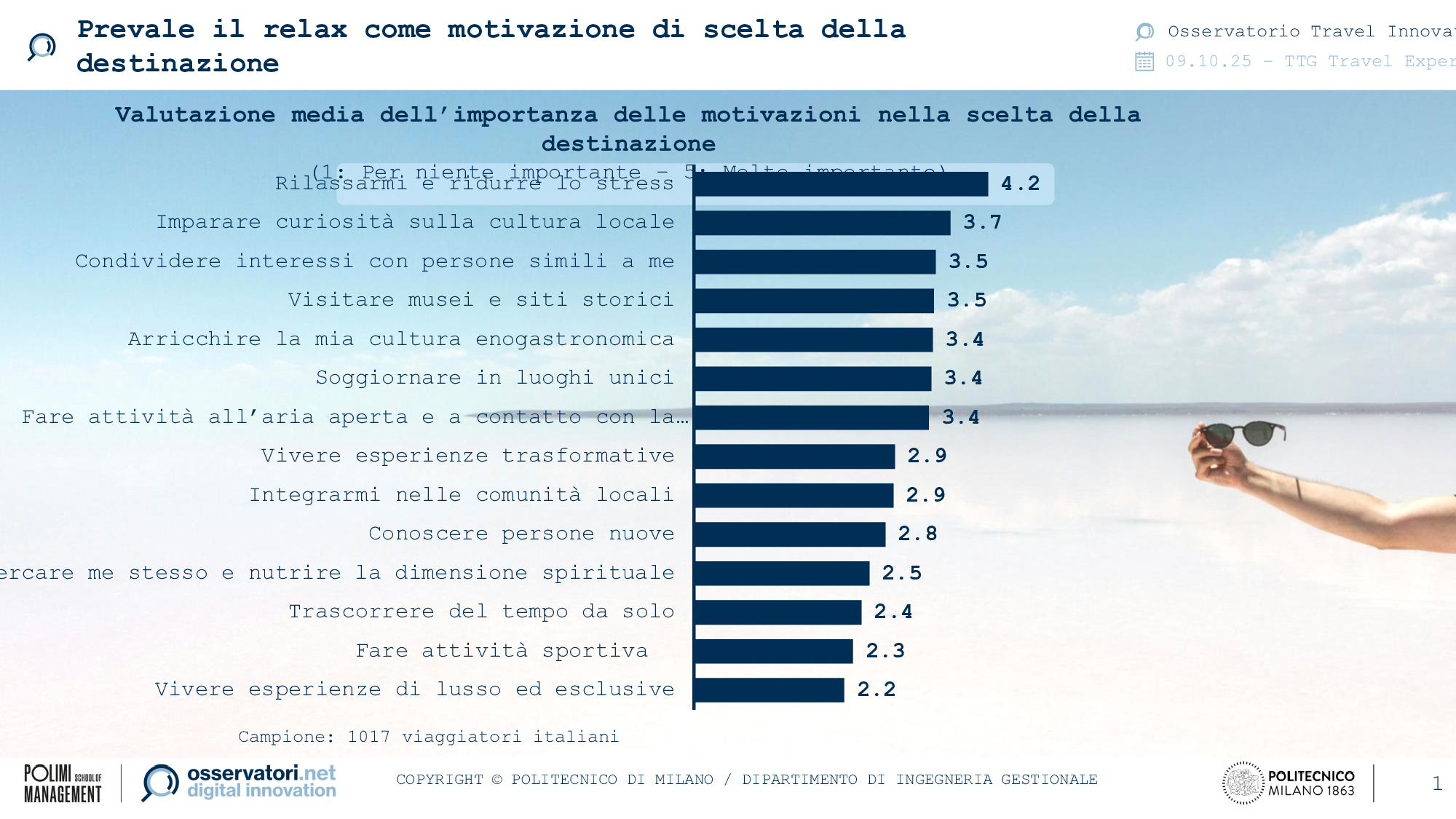 Dall’indagine su oltre 1.000 viaggiatori italiani emerge che gli italiani effettuano in media 4 viaggi all’anno. La motivazione principale di scelta della destinazione è il desiderio di rilassarsi e ridurre lo stress (valutazione media 4,2 su 5), seguita dall’interesse a conoscere la cultura locale e condividere interessi con persone simili a sé.