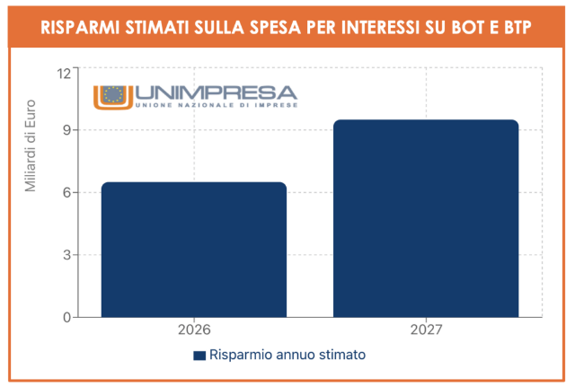 La discesa dello spread tra BTP e Bund fino a 69 punti base e l’ipotesi che questo livello si mantenga stabile nei prossimi due anni, cioè sotto i 70 punti base, potranno garantire all’Italia risparmi ancora più consistenti sul fronte della spesa per interessi. Secondo una nuova stima del Centro studi di Unimpresa, aggiornata alle condizioni dei mercati delle ultime settimane, nel 2026 il minor costo del debito potrebbe attestarsi tra i 6 e i 7 miliardi di euro, per poi salire fino a 9-10 miliardi nel 2027, grazie all’effetto cumulativo del rifinanziamento dei titoli in scadenza. Complessivamente, il “tesoretto” potenziale per il biennio 2026-2027 può quindi raggiungere i 15-17 miliardi di euro. La valutazione si fonda su uno scenario in cui lo spread si mantiene intorno ai 70 punti base e il Tesoro continua a collocare ogni anno circa 500 miliardi di euro di titoli di Stato tra nuove emissioni e rinnovi. Il confronto con i picchi del 2022-2023, quando il differenziale superava stabilmente i 200 punti base e il rendimento del decennale italiano viaggiava in area 4,5-5%, mette in evidenza una compressione superiore ai 130-150 punti base: una dinamica che, tradotta in termini di costo medio del debito, consente di stimare un avvicinamento dal 3,3% verso il 2,9-3%, liberando spazi significativi per la gestione dei conti pubblici. Dal 2022, quando al governo c’era Mario Draghi come premier, il divario tra Italia e Germania si è ridotto di 176 punti base pari a un calo del 72%.