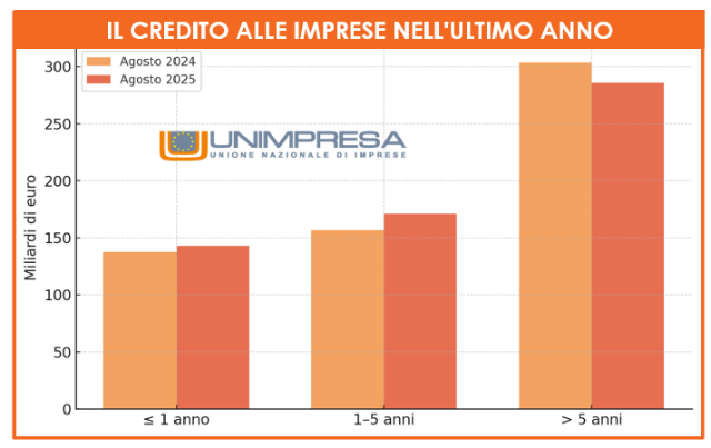 Secondo il Centro studi di Unimpresa, che ha elaborato i dati statistici della Banca d’Italia, Tra agosto 2024 e agosto 2025, il credito complessivo erogato dal sistema bancario al settore privato in Italia mostra un andamento di sostanziale stabilità, con una lieve crescita in valore assoluto e profonde differenze tra famiglie e imprese. Il totale dei finanziamenti passa da 1.259,7 miliardi di euro a 1.275,4 miliardi, con un incremento complessivo di 15,7 miliardi, pari a una variazione dell’1,2%. Una dinamica moderata, che riflette un contesto di politica monetaria in progressivo allentamento, ma ancora caratterizzato da tassi relativamente elevati nella prima parte del periodo, e un atteggiamento di prudenza diffusa sia da parte del sistema bancario sia della clientela produttiva. L’espansione del credito è infatti trainata quasi esclusivamente dalle famiglie, mentre le imprese si muovono in un quadro di sostanziale cautela, orientato più alla gestione della liquidità che all’investimento di lungo periodo.