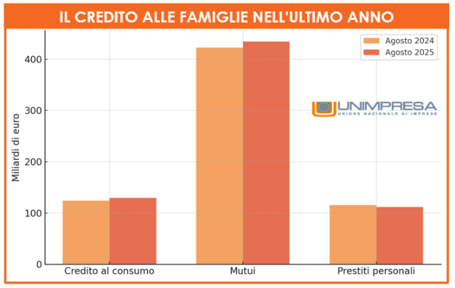 L’aumento è trainato quasi interamente dalla componente delle famiglie consumatrici, che registrano un’espansione costante e strutturale, mentre le società non finanziarie mostrano un andamento sostanzialmente stagnante, con un lieve incremento di carattere prevalentemente tattico e non legato a nuovi investimenti: i finanziamenti a questo comparto passano da 597,7 miliardi di euro ad agosto 2024 a 600,2 miliardi ad agosto 2025, con un aumento di appena 2,5 miliardi, pari a +0,4%.