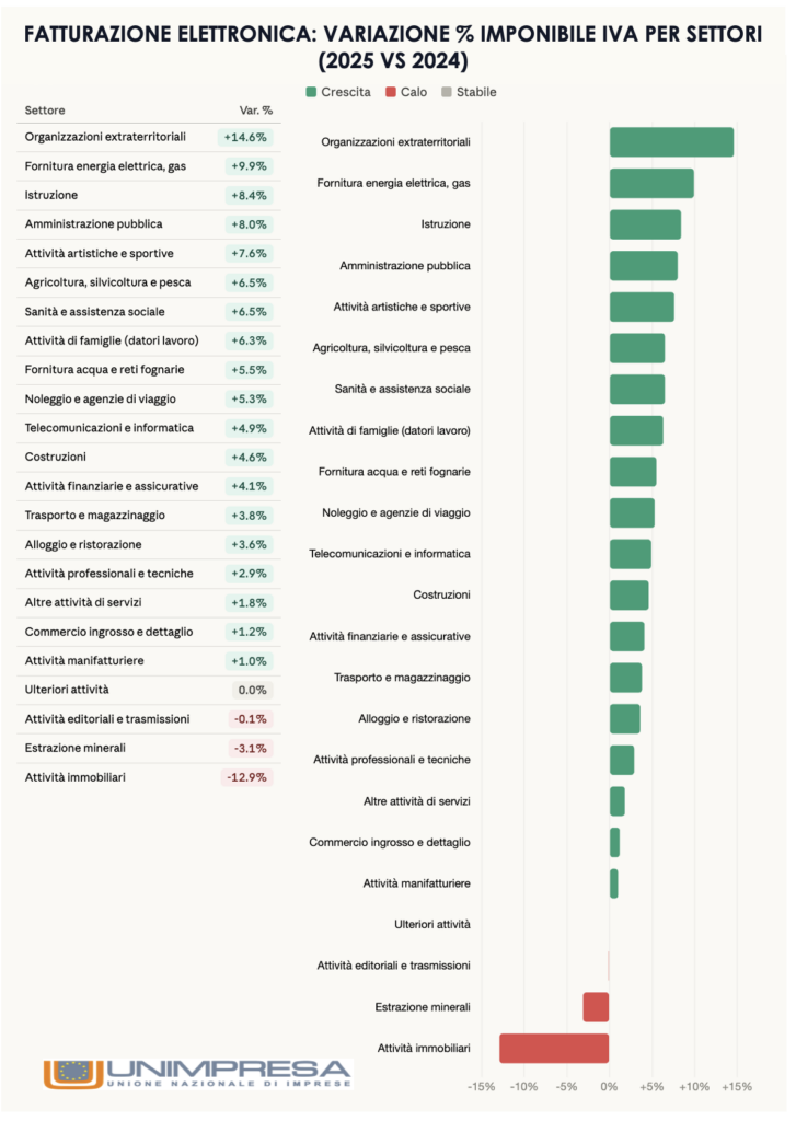 Secondo il Centro studi di Unimpresa, che ha rielaborato dati del Ministero dell’economia, l’andamento della fatturazione elettronica nel 2025 restituisce l’immagine di un’economia italiana solida e in graduale consolidamento, capace di crescere anche in un contesto internazionale complesso. Nel complesso, l’imponibile IVA registra un aumento del 2,6% su base annua, un dato che conferma la resilienza del sistema produttivo e la sua capacità di adattamento alle nuove condizioni economiche.  A sostenere questa dinamica sono soprattutto le imprese, con un incremento del 2,7%, mentre anche le persone fisiche contribuiscono, seppur in misura più contenuta (+0,8%). Il fatto che oltre il 93% dell’imponibile complessivo sia generato da soggetti economici organizzati rappresenta un segnale di stabilità e di centralità del tessuto imprenditoriale, che continua a essere il pilastro della crescita nazionale.