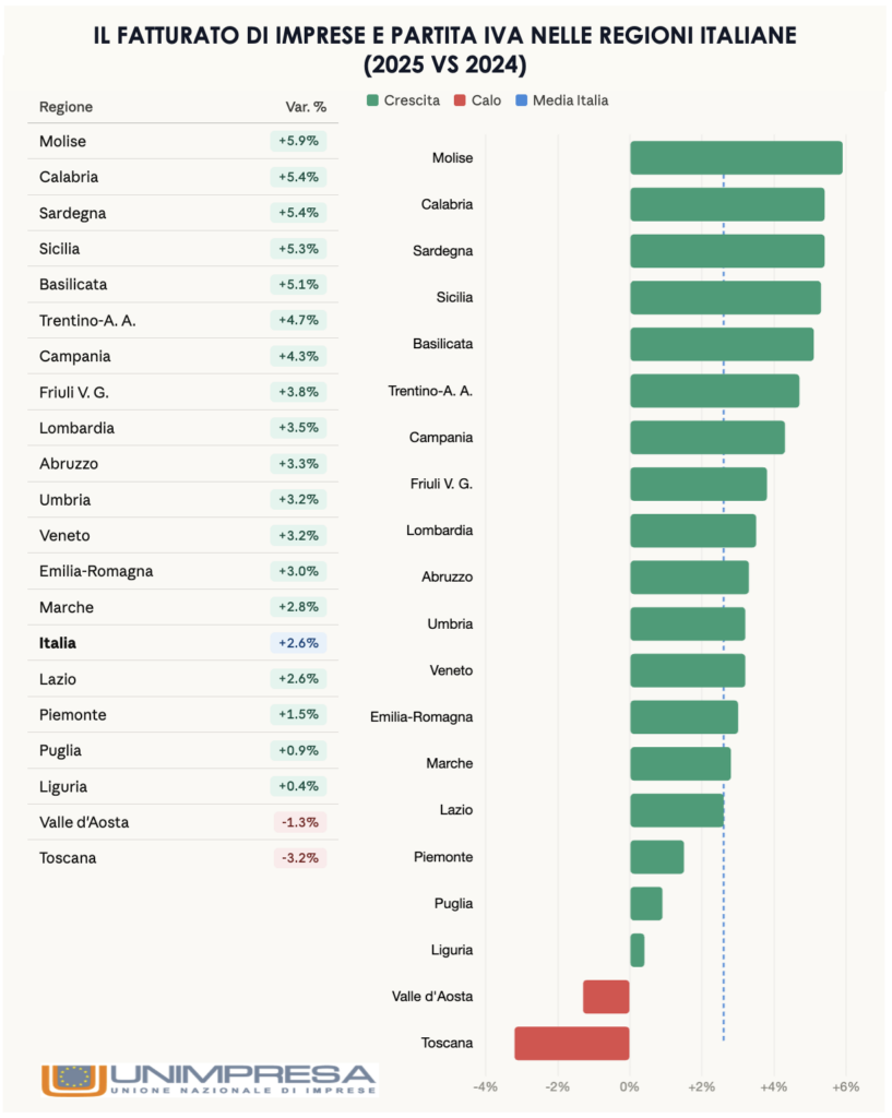 La crescita appare diffusa lungo tutta la Penisola, con risultati particolarmente dinamici nel Mezzogiorno: Molise (+5,9%), Calabria (+5,4%), Sardegna (+5,4%), Sicilia (+5,3%) e Basilicata (+5,1%) registrano le migliori performance. Positivi anche i dati di Trentino-Alto Adige (+4,7%), Campania (+4,3%), Friuli Venezia Giulia (+3,8%), Lombardia (+3,5%), Abruzzo (+3,3%), Umbria (+3,2%), Veneto (+3,2%) ed Emilia-Romagna (+3,0%). In linea con la media nazionale Marche (+2,8%) e Lazio (+2,6%), mentre risultano più contenuti gli incrementi di Piemonte (+1,5%), Puglia (+0,9%) e Liguria (+0,4%). In controtendenza Toscana (-3,2%) e Valle d’Aosta (-1,3%).