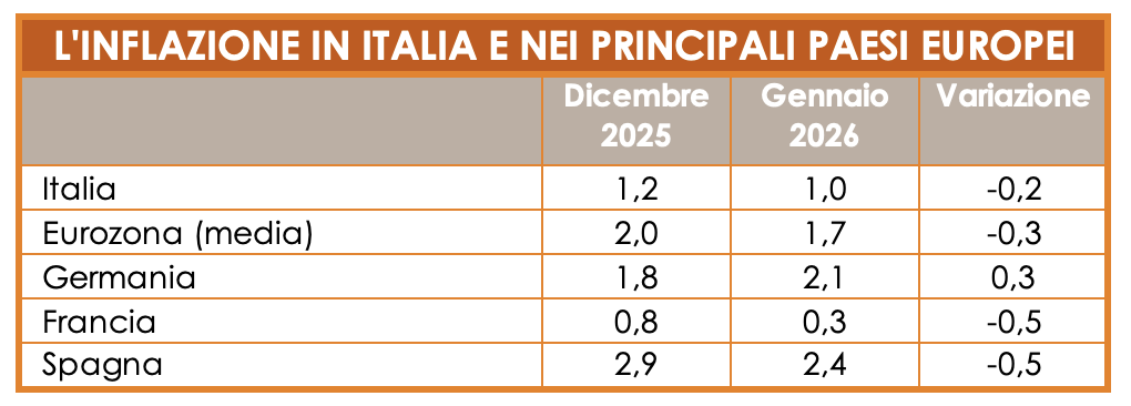 Nel complesso, il dato di gennaio conferma un’Eurozona in fase di disinflazione ma ancora molto eterogenea. In questo contesto, l’Italia si distingue per un’inflazione più bassa sia nel dato corrente sia in prospettiva, con un indice previsto, per quest’anno, intorno all’1,6%, stabilmente inferiore alla media europea.