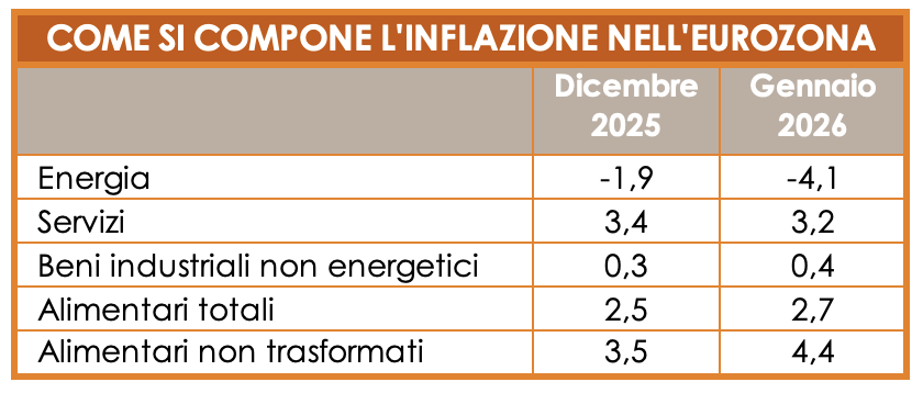I servizi, pur restando la componente più rigida dell’inflazione, rallentano dal 3,4% al 3,2% annuo, minimo dallo scorso settembre. I beni industriali non energetici accelerano leggermente, salendo allo 0,4% su base annua. L’inflazione alimentare complessiva cresce dal 2,5% al 2,7%, trainata dai prodotti non trasformati, che passano dal +3,5% al +4,4%. In questo contesto, l’inflazione core dell’Eurozona scende di un decimo al 2,2%. Per il 2026, le stime indicano un’inflazione media dell’area euro pari all’1,9%, con la core intorno al 2%. In Italia, il quadro appare strutturalmente più moderato.