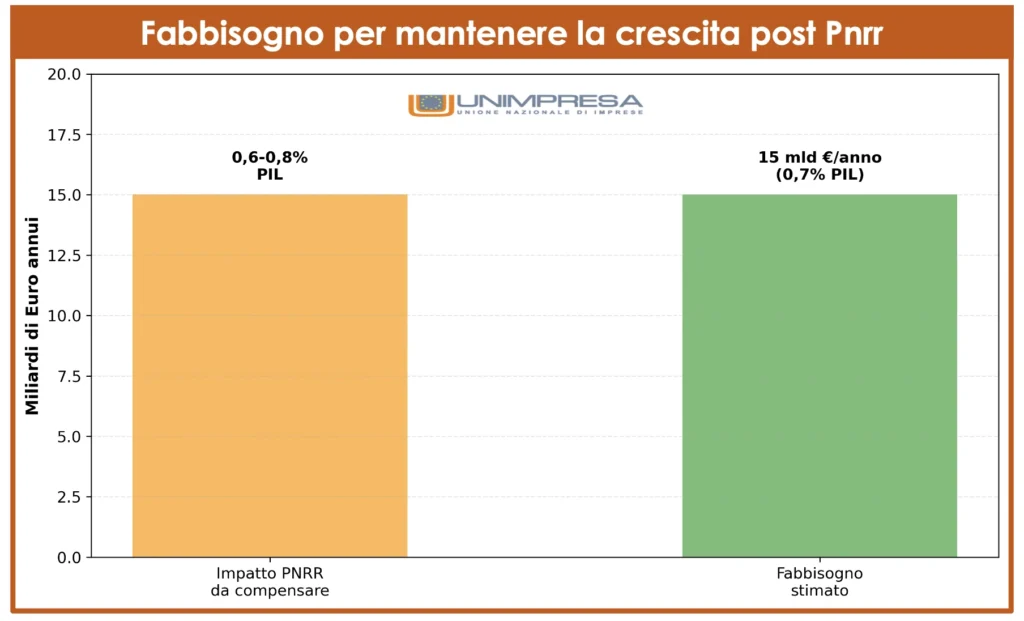 In valori correnti significa circa 15 miliardi di euro l’anno. Questa è la stima prudente delle risorse necessarie non per replicare il volume lordo della spesa Pnrr, ma per salvaguardarne l’impatto macroeconomico.